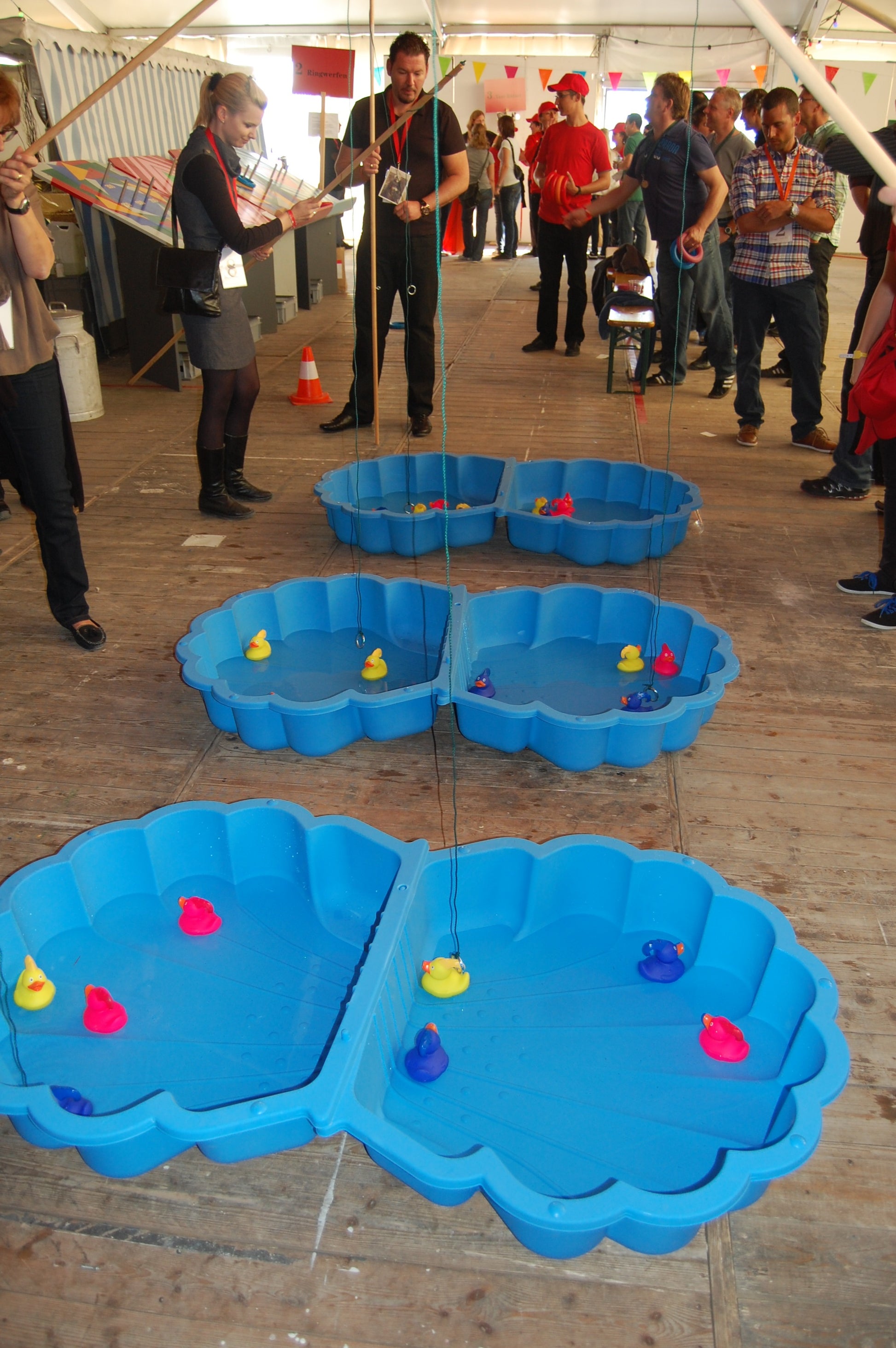 Die putzigen Entchen sollen aus den beiden Halbschalen der Muschel, gefüllt mit Wasser gefischt werden. Enten angeln ist gar nicht so einfach? Als Option können eine oder zwei Halbschalen auf einem Drehteller (230 Volt, zus. Fr. 50.-) montiert werden um das Fischen zu erschweren. Für Kinder und Erwachsene geeignet. Set à 2 Halbschalen, 18 Enten und 6 Angeln.