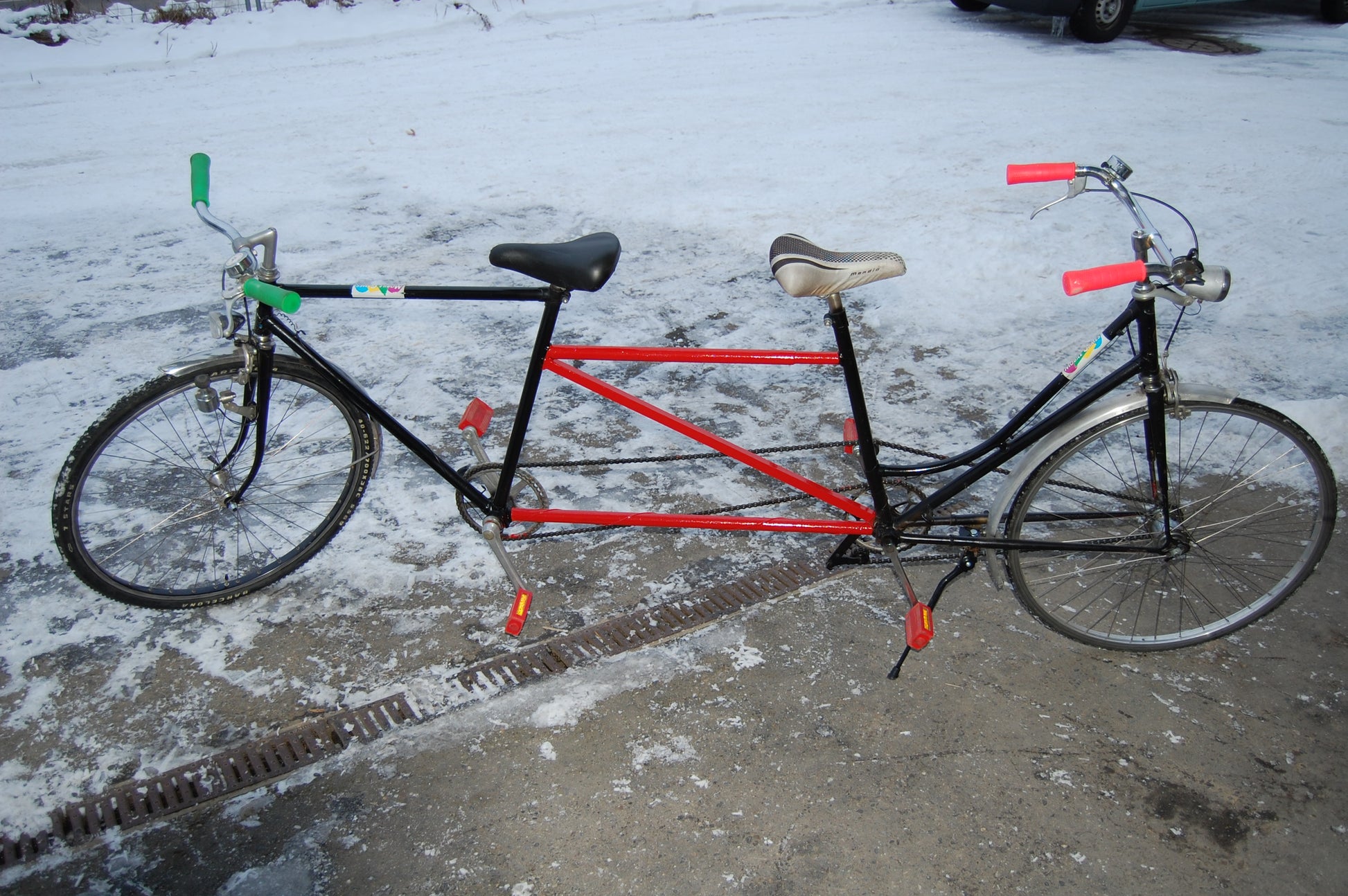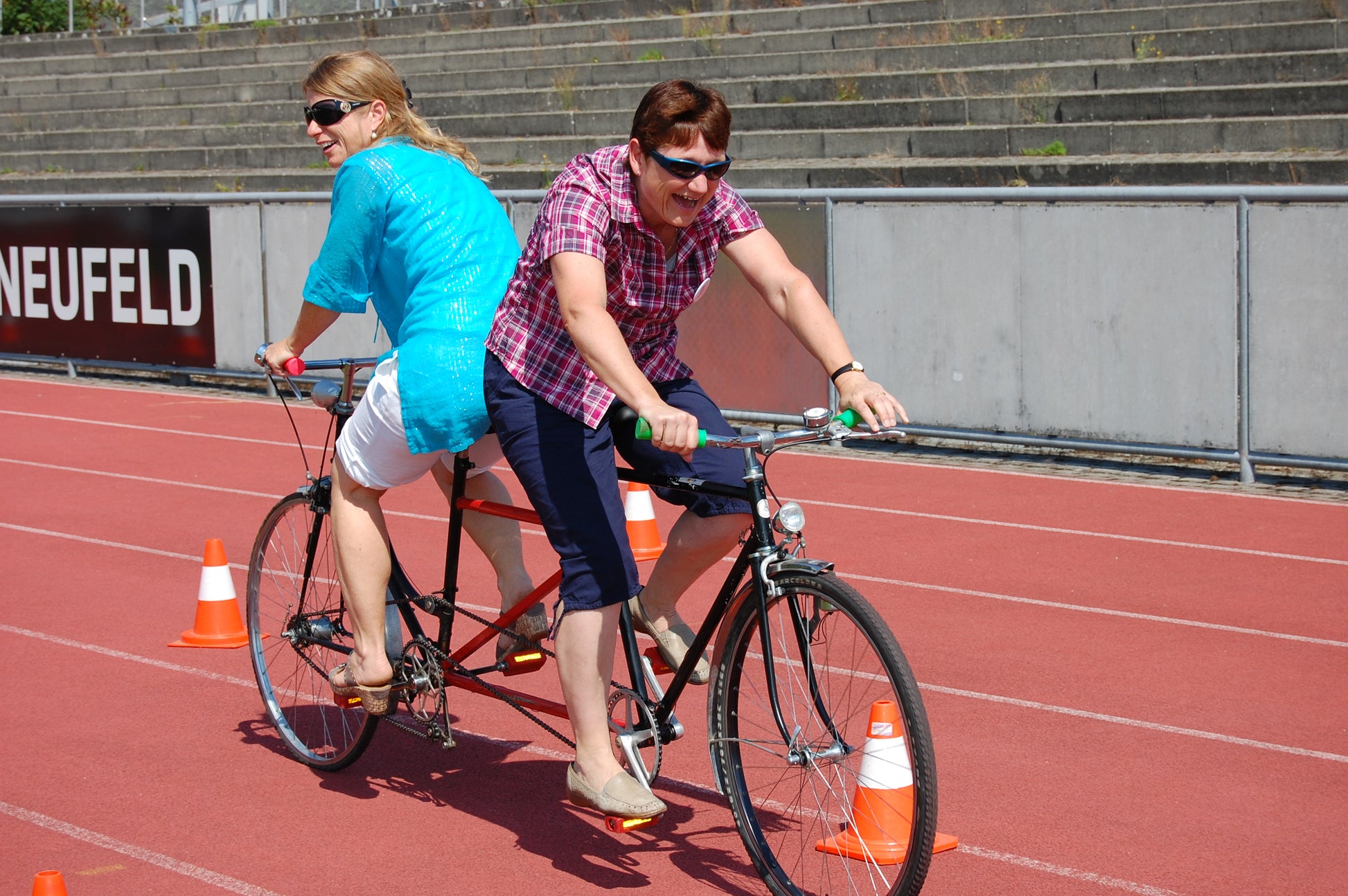 Auf unserem Tandem sitzen die beiden Fahrer mit dem Rücken zu einander, d.h. einer von beiden fährt rückwärts und der andere steuert.
