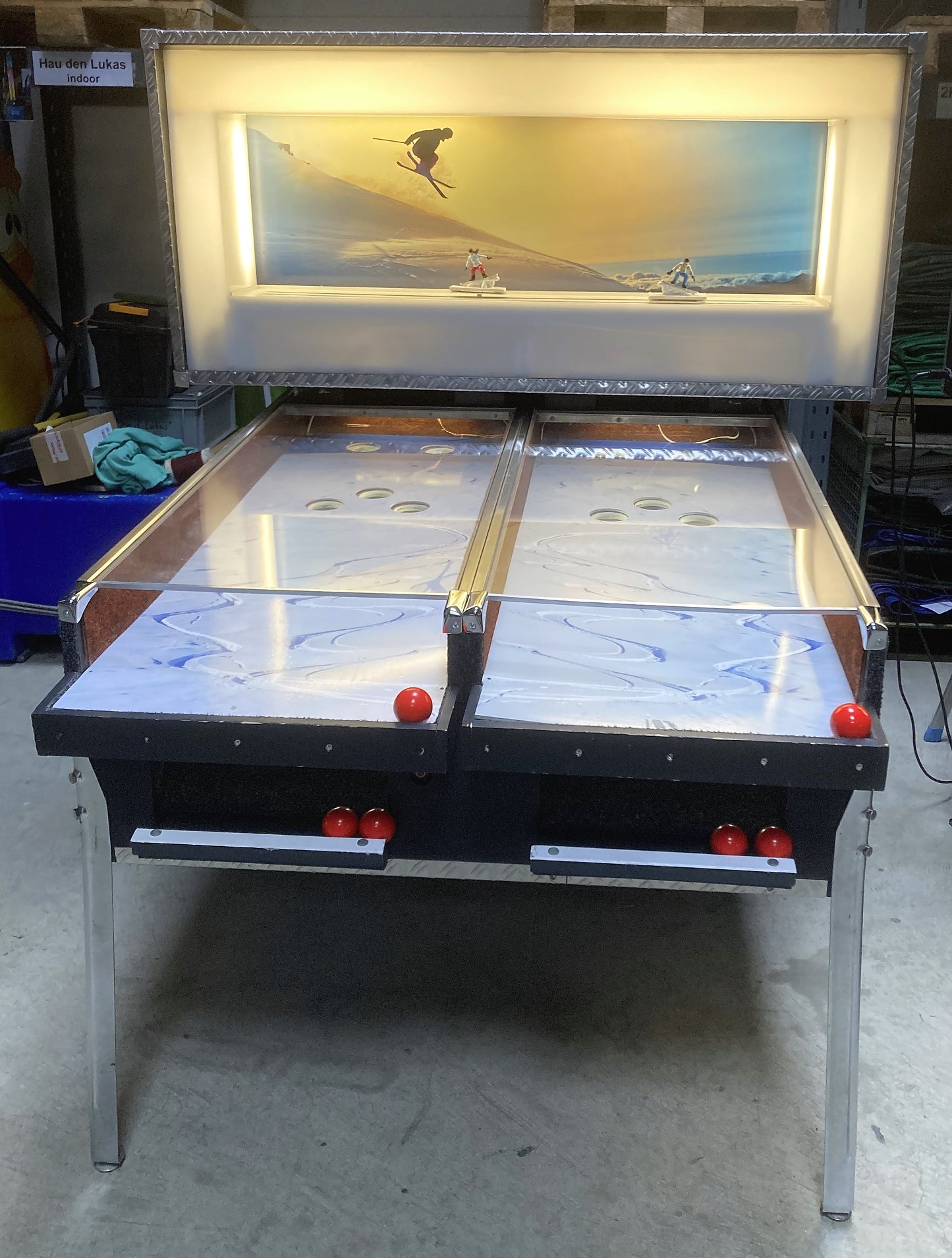Wer seine Kugeln am besten in den Löchern platzieren kann, dessen Skifahrer erreicht als erstes das Ziel. Zwei Spieler spielen gegeneinander im Kampf gegen die Genauigkeit des Kugelstossen. Das Spiel kann optisch Ihren Wünschen angepasst werden. Option: Mit 4 Spieler Fr. 1300.-