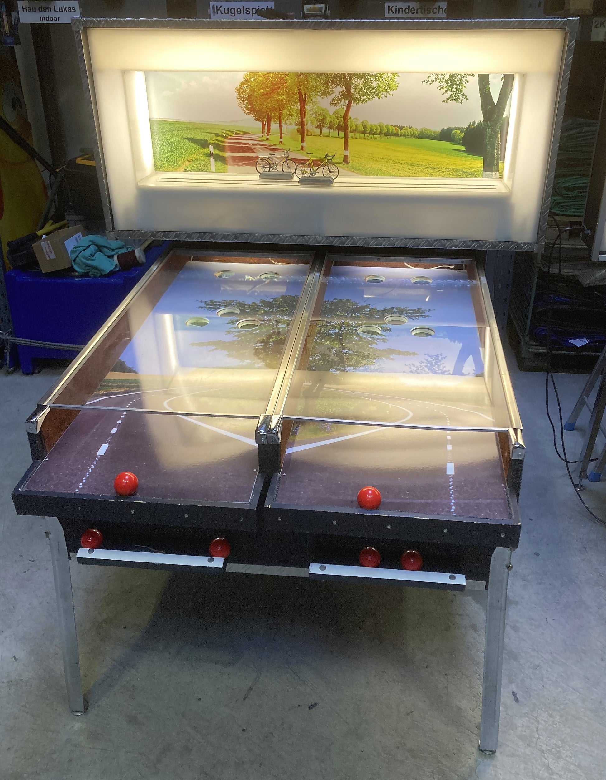 Wer seine Kugeln am besten in den Löchern platzieren kann, dessen Bike erreicht als erstes das Ziel. Zwei Spieler spielen gegeneinander im Kampf gegen die Genauigkeit des Kugelstossen. Das Spiel kann optisch Ihren Wünschen angepasst werden. Option: Mit 4 Spieler Fr. 1300.-