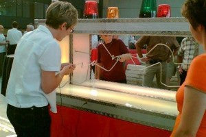 Sehr schönes Geschicklichkeitsspiel. Mit einem gebogenen Handdraht muss dem Heissen Draht ohne Berühren entlang gefahren werden. Dank verschiedenen Handdraht-Grössen kann der Schwierigkeitsgrad angepasst werden. Mit Licht- und Toneffekten. Wenn Sie den Heissen Draht berühren ertönt eine Klingel und ein rotes Licht brennt. Nach einem Reset fängt das Spiel wieder von Vorne an. Sollten Sie bis zum Ende des Drahtes kommen brennt eine grüne Lampe. So ist auch für die Zuschauer sofort ersichtlich wie es mit dem Teilnehmer steht. Beim duell werden die Spiele Rücken an Rücken aufgestellt und die beiden Teilnehmer starten gleichzeiti. Beide haben die genau gleichen Voraussetzungen.