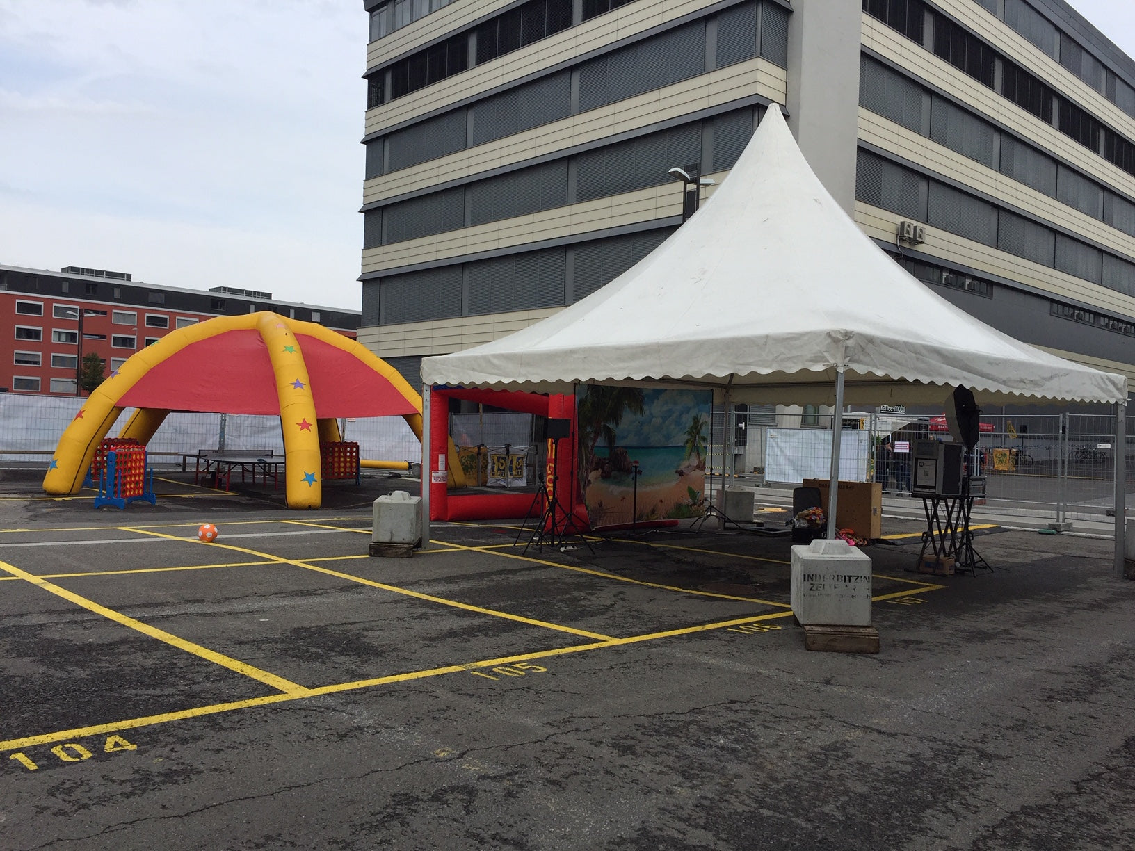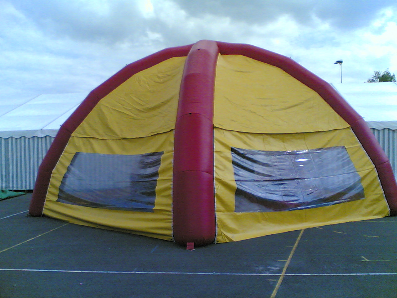 Das aufblasbare Partydom schützt Sie vor Regen und Sonne. Die Seitenwände sind flexibel montier- und abnehmbar. Es werden 3 Minuten benötigt, um das Partydom aufzublasen. Dieser Partydom hat rote Stützsäulen, gelbe Seitenwände und ein gelbes Dach.