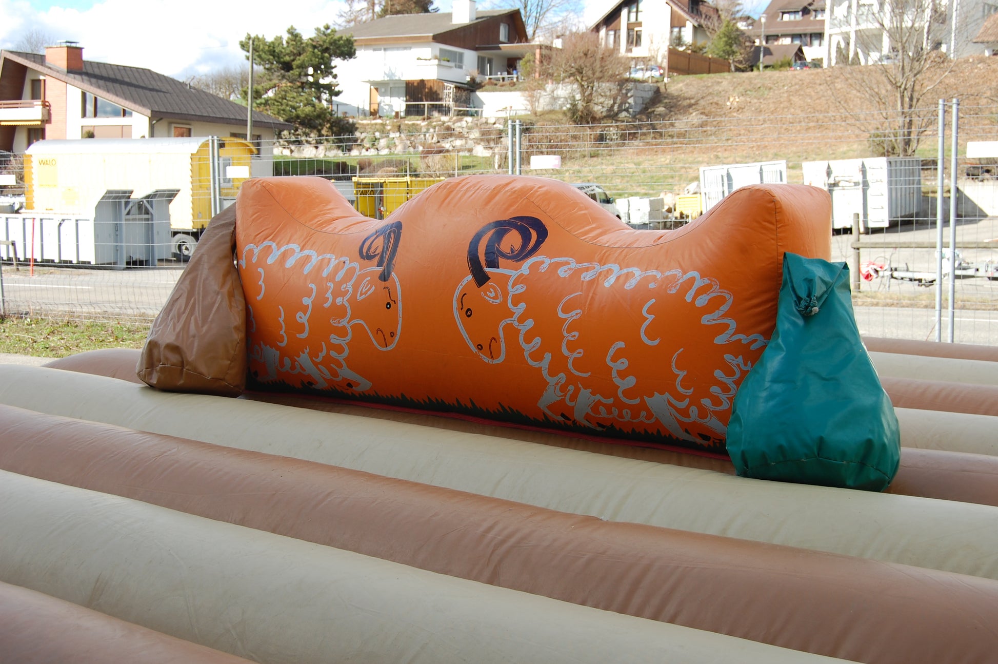 Wer lässt sich als erster vom bockenden Schaf werfen? Alles was es braucht, ist sich durch den Mitspieler nicht aus der Balance bringen zu lassen. Aber die weiche Keule des Gegners ist überall. Wenn alles nichts nützt, lässt man sich beruhigt vom Schafbock fallen, denn man fällt ja weich in das aufgeblasene Kissen.