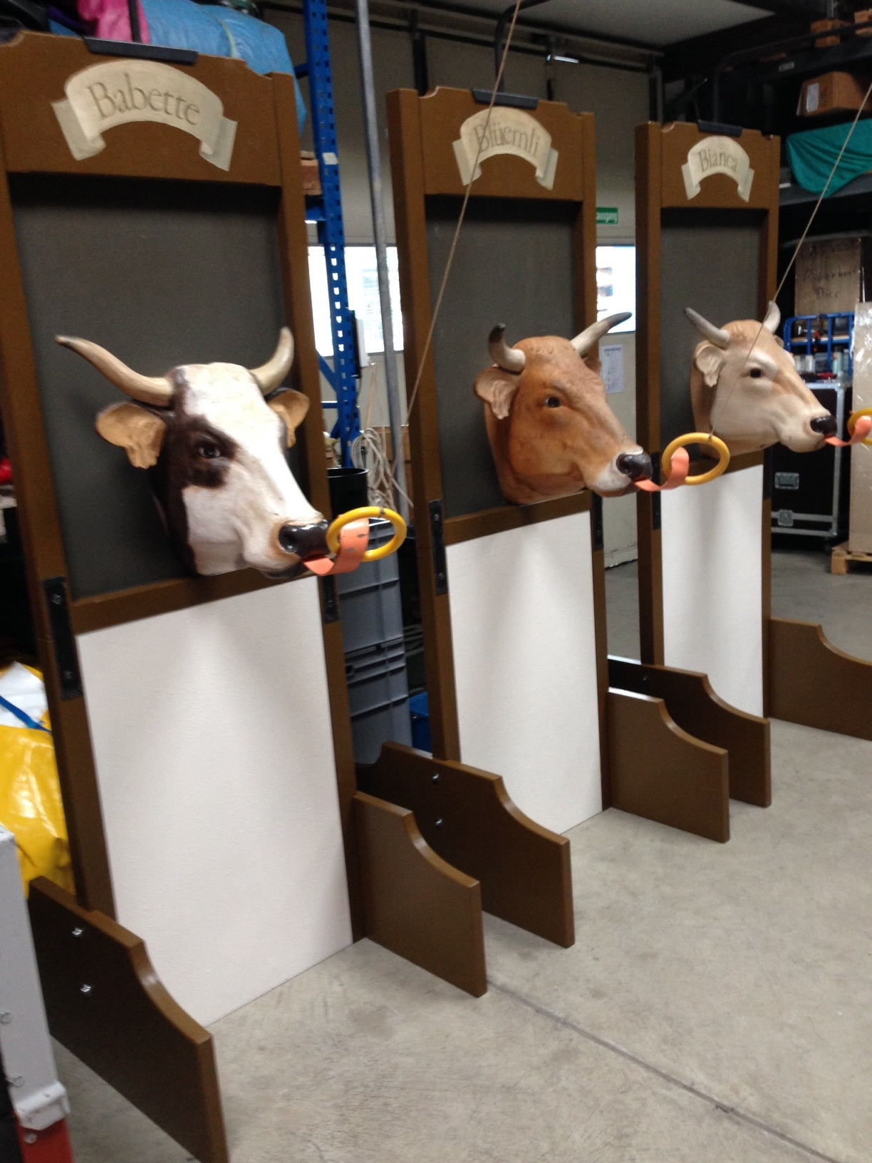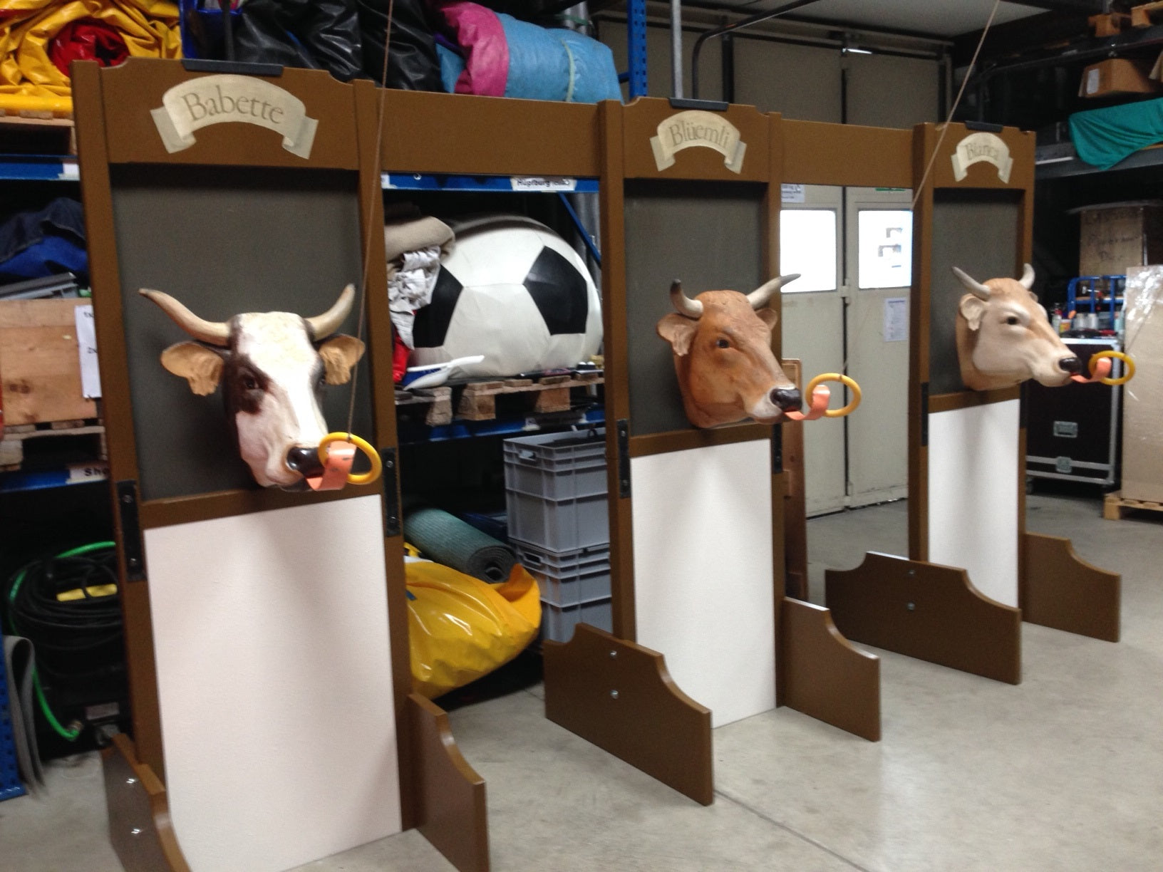 Alle unsere 3 Eigenanfertigungen vom Künstler in einem Stall. Das Ziel des Spieles ist es, mit einem gezielten Rechtsschwung den Ring so auf die herausgestreckte Zunge der Kuh zu schwingen, dass er hängen bleibt.