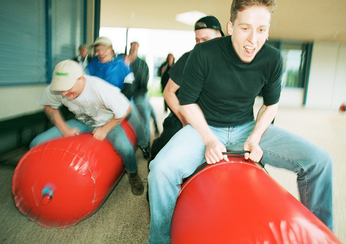 2 Luftwürste, auf denen gleichzeitig je 4 Personen sitzen und vorwärtshüpfen müssen.